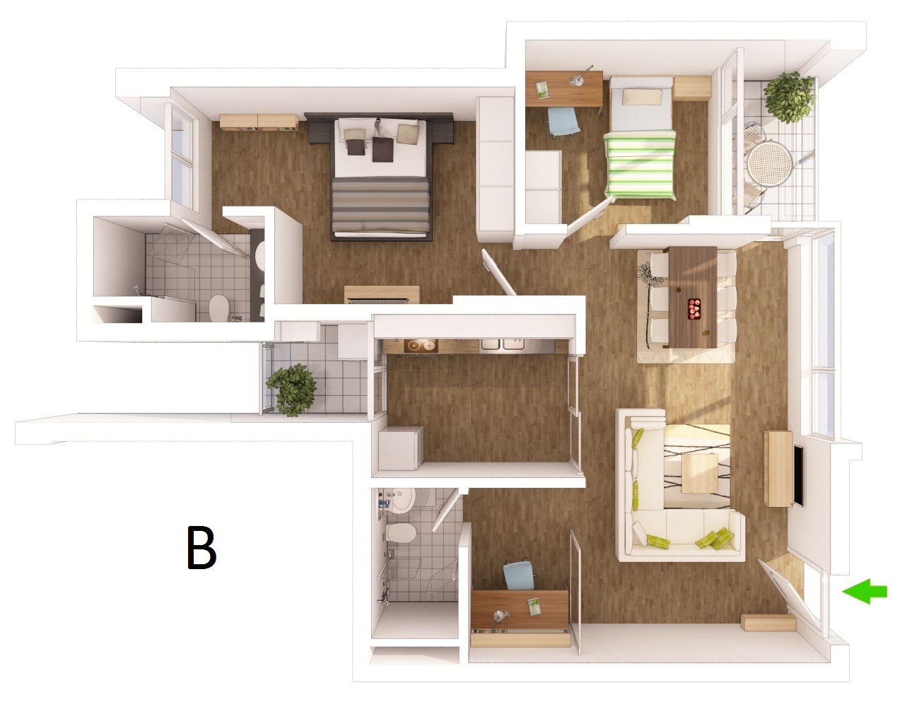 Loại B – 83m²: 2PN rộng, 2WC, có thể thêm phòng nhỏ hoặc phòng đọc
