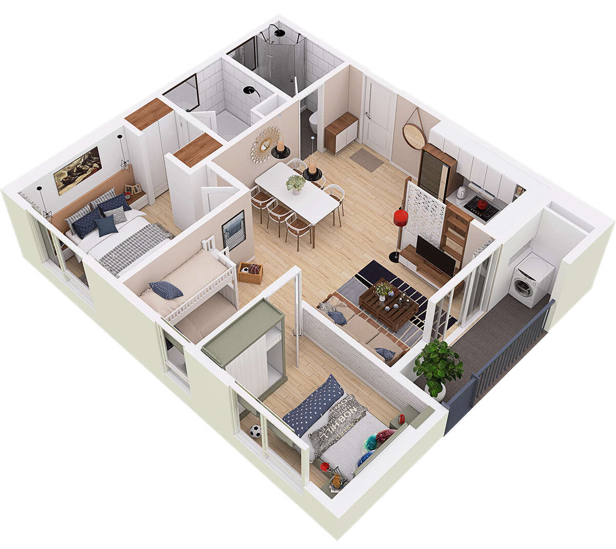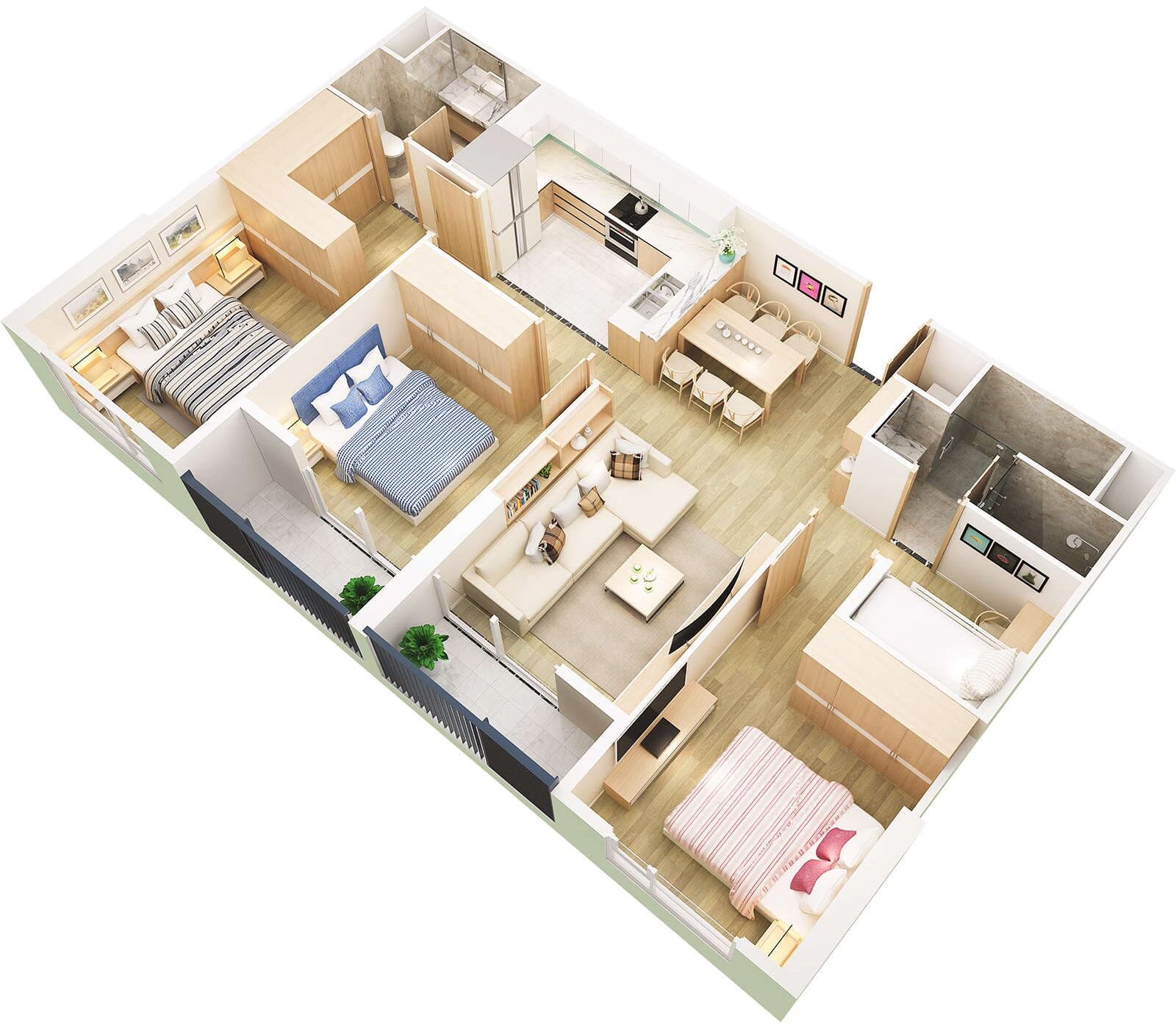 Căn 90m²: bố trí 3 phòng ngủ rộng rãi, phòng khách thoáng, phù hợp gia đình đông thành viên.